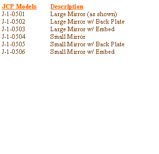 The overall size of the small mirror assembly is 10� x 11-1/2� x 5/16� thick, with the actual mirror area of 8� x 9-1/2�.� The mirror panel is 20 gauge stainless steel polished to a mirror finish approximating that of glass.� The mirror frame is 14 gauge steel with a satin chrome finish.� The optional small mirror back plate and embed are as described above, sized to the small mirror dimensions. |