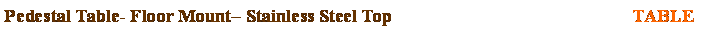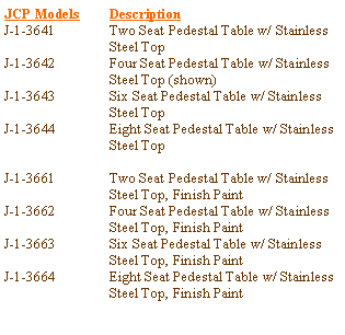 JCP Specifications:� Pedestal table tops are 40� x 40� and are fabricated from 10 gauge stainless steel, which is reinforced with a 10 gauge HRPO steel plate.� Additional top reinforcement is provided by four 10 gauge HRPO steel channels from the pedestal to the edge of the table top.� The single pedestal is fabricated from a 7 gauge x 4� x 4� tube steel and is welded to the top reinforcement and the 3/8� x 18� x 18� Base Plate, which has eight 1/2� holes for securing the pedestal table to the floor.� The seat support is fabricated from 7 gauge x 3� x 4� tube steel and the distance from edge of the seat top to edge of the opposite seat top is 66�.� The 12� diameter seat top is fabricated from 14 gauge stainless steel and has a 7 gauge HRPO reinforcement plate.� The table is shipped as one unit and receives one shop coat of our standard primer, excluding the stainless steel top and seat tops which have a random orbital finish.